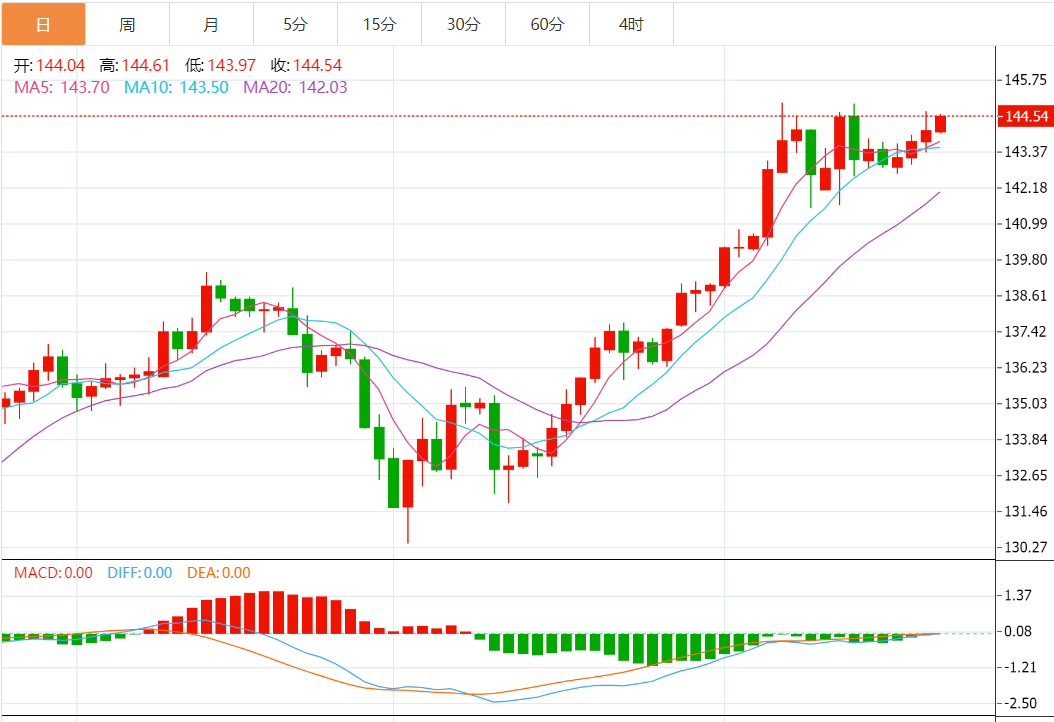 分别位于142.00和139.00的20和50EMA均线上升,暗示汇价继续看涨。此外14天相对强弱指标继续在看涨区间60.00-80.00内波动,表明上行势头完好。若果断升破24年新高145.40,将推动该资产指向1998年6月高点146.79,然后为1998年8月高点147.67。
