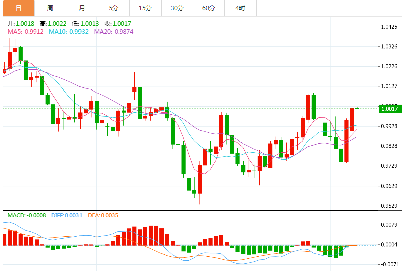 技术上,日图在前期低点0.9700上方录得大阳线后进一步走高,并向上突破100日均线和1.0000平价关口阻力,随机指标倾向进一步走高,仍看涨。4小时图在0.9730一线企稳震荡走高,上行动能维持完好。小时图短期均线向上发散提供支持,关注1.0000一线能否企稳。