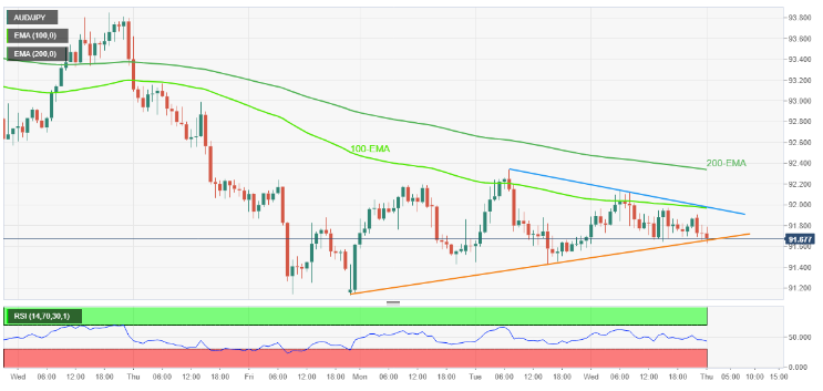 另外,周二以来的100小时指数移动均线(EMA)和下降趋势线汇合于92.00附近将构成澳元/日元短线阻力。