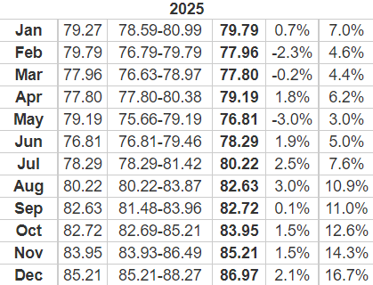值得注意的是,2022年4月的目标已经实现,而日线图上的价格模式表明,2022年5月的79.19的价格目标很有可能在6月实现。事实上,这使得美元对印度卢比2025年的预测相当可行,尽管有一些小的差异。进行自己的个人研究是至关重要的。
