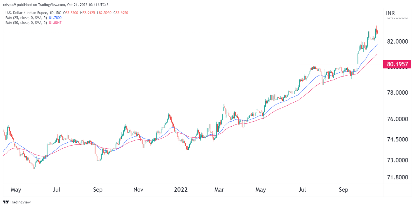 由于投资者对美联储极端鹰派的言论做出反应,美元兑印度卢比的价格飙升至历史新高。美联储今年已经加息300个基点,分析师预计今年将加息超过125个基点。下一次加息将在7月份的FOMC会议上进行。