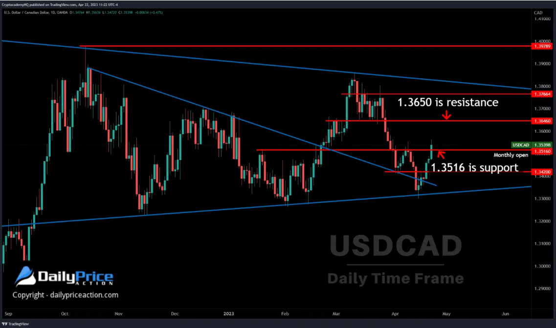 果然,美元兑加元上周在守在1.3350上方后反弹了150个点。该货币对上周也收于1.3516月开盘价之上,本周该月开盘价为1.3650,但前提是该月开盘价在日时间框架上保持支撑位。