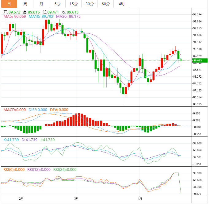 或者,跌破4月13日低点88.98将拖累风险指标向3月30日低点88.40靠拢。如果跌破后者,将进一步拖累该资产跌向4月6日的低点87.59。