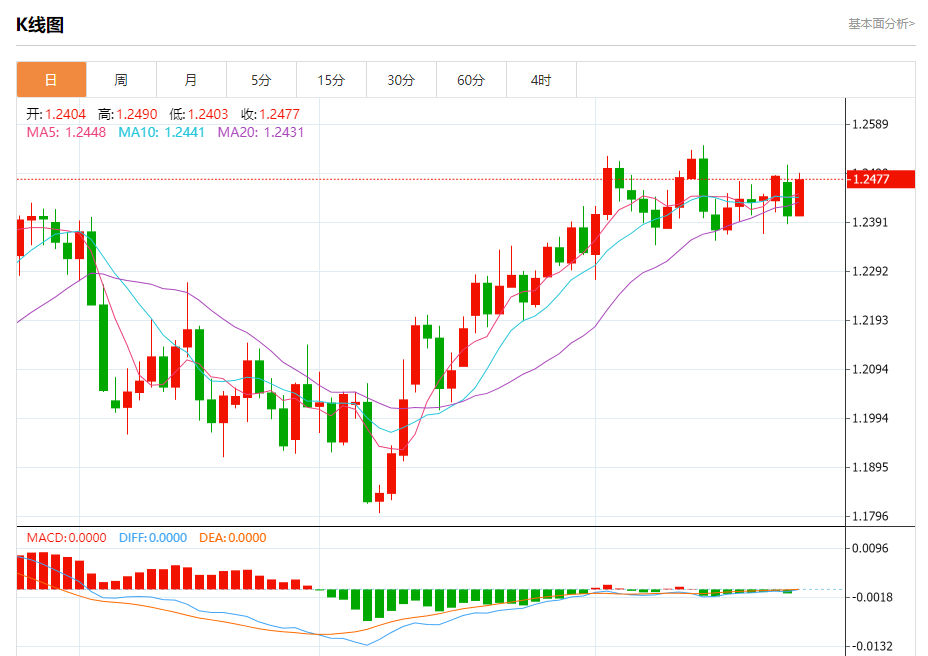 今日周三,欧元兑美元报1.1054,涨幅0.75%;英镑兑美元报1.2472,涨幅0.54%;美元兑日元报133.685,跌幅0.04%。