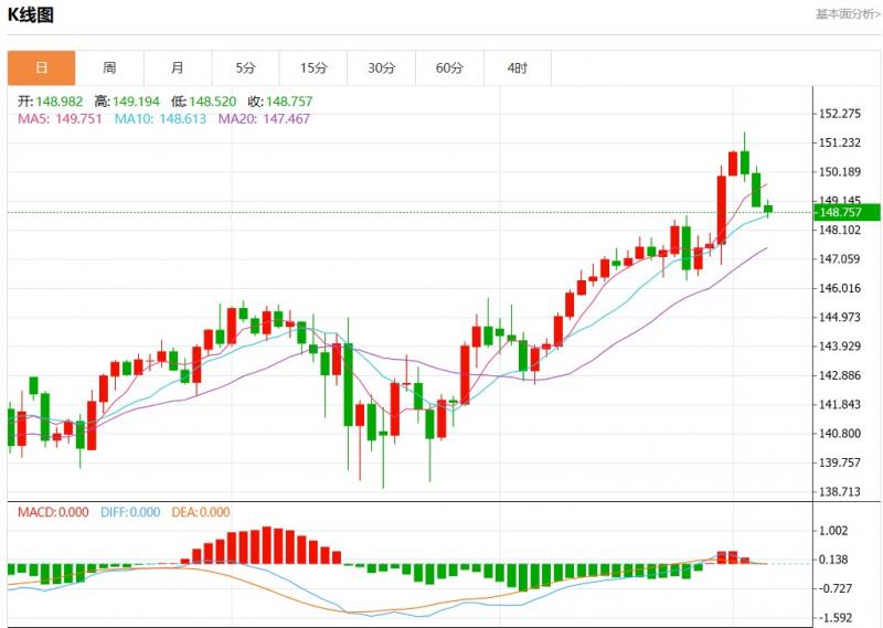 周四盘中,欧元兑日元报148.715,跌幅0.12%