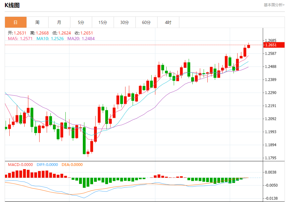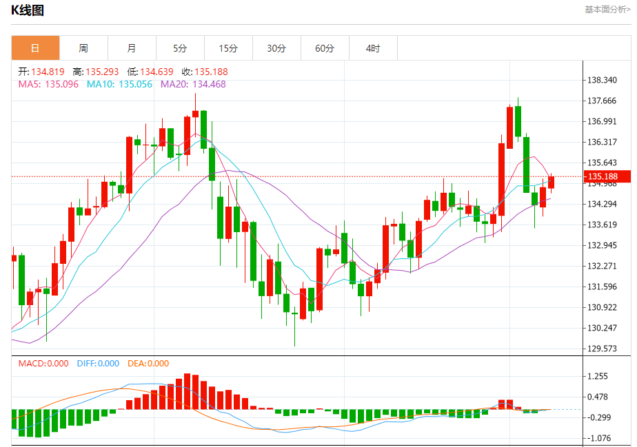 今日周一,欧元兑美元报1.1035,涨幅0.14%;英镑兑美元报1.2649,涨幅0.15%;美元兑日元报135.203,涨幅0.27%。