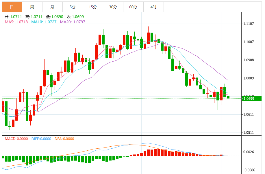 周一,欧元/美元徘徊于1.0700关口下方,现交投于1.0700附近,跌幅0.10%。