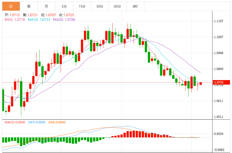 周二,欧元/美元徘徊于1.0726关口下方,现交投于1.0726附近,涨幅0.13%。