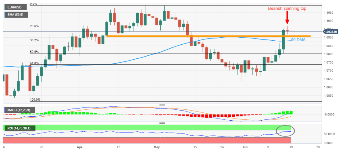 值得注意的是,美国的六月一日假期也加入了欧元/美元对日图上的看跌旋转顶部烛台和超买RSI(14)线,以取悦最近的欧元空头。