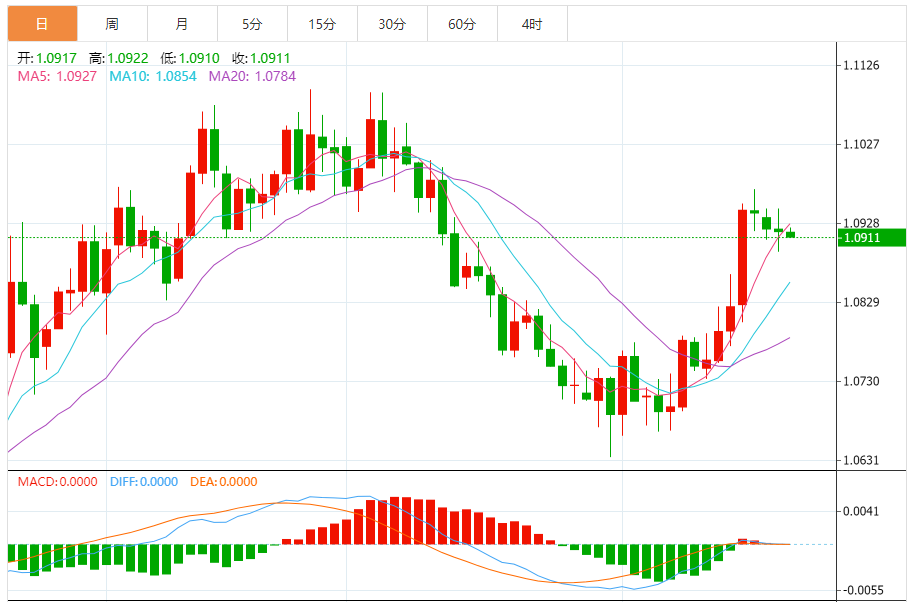 周三,欧元/美元徘徊于1.0911关口下方,现交投于1.0911附近,跌幅0.06%。
