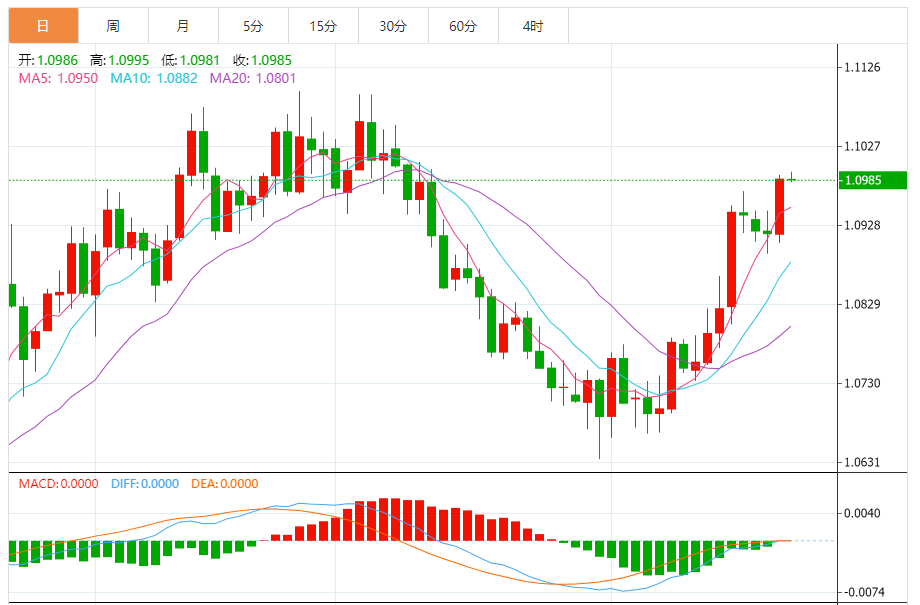 周四,欧元/美元徘徊于1.0985关口下方,现交投于1.0985附近,跌幅0.01%。