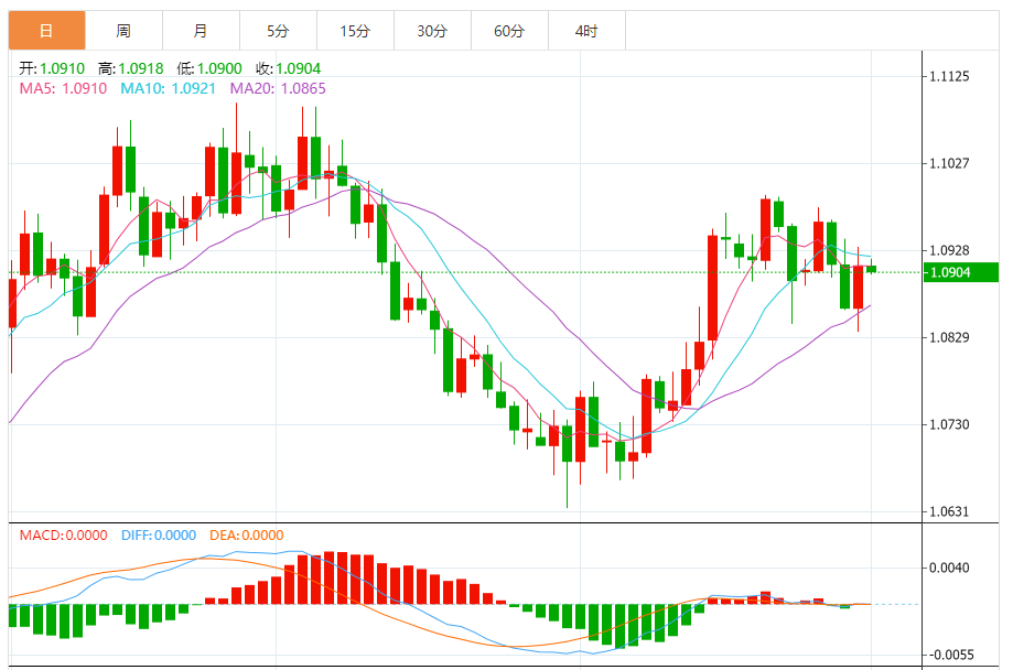 周一,欧元/美元徘徊于1.0905关口下方,现交投于1.0905附近,跌幅0.06%。