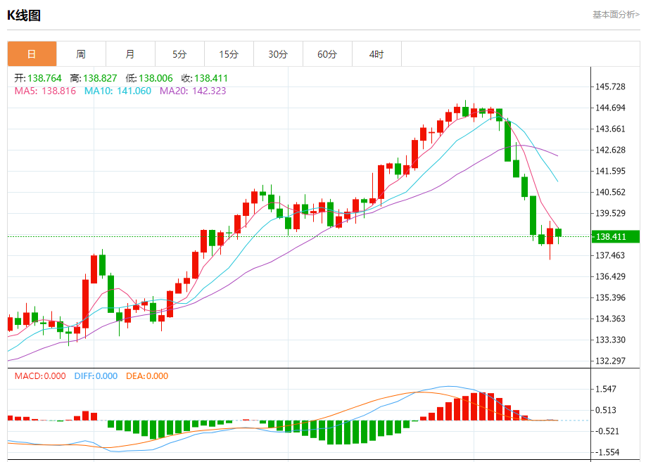 今日周一,欧元兑美元报1.1235,涨幅0.05%;英镑兑美元报1.3086,跌幅0.06%;美元兑日元报138.369,跌幅0.31%。
