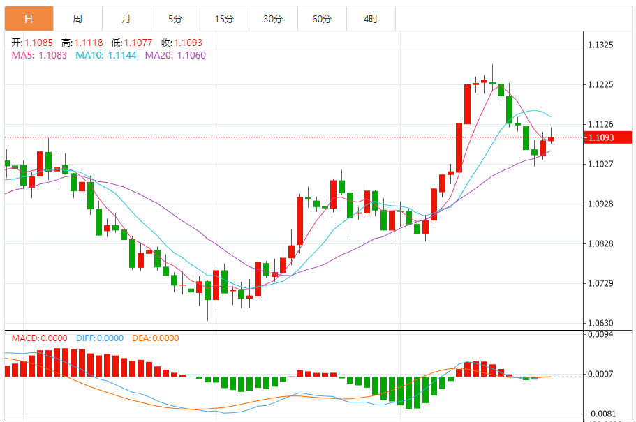 周四,欧元/美元徘徊于1.1094关口下方,现交投于1.1094附近,涨幅0.07%。