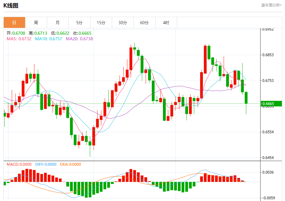 今日周五,澳元兑美元报0.6666,跌幅0.65%;美元兑加元报1.3218,跌幅0.05%;美元兑瑞郎报0.8683,跌幅0.07%。