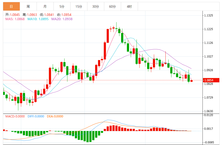 周三,欧元/美元徘徊于1.0855关口下方,现交投于1.0855附近,涨幅0.08%。