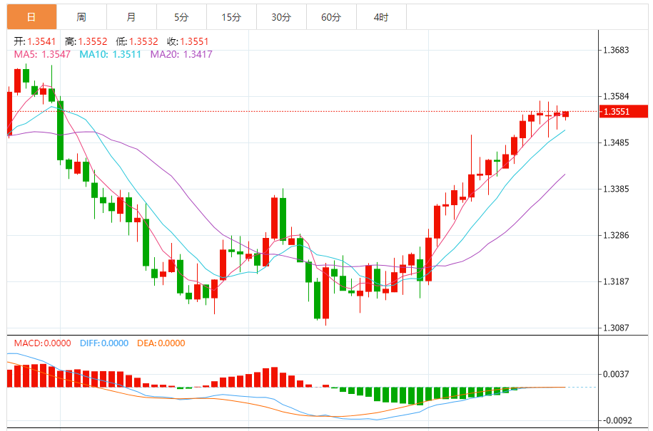 周三,美元/加元徘徊于1.3553关口下方,现交投于1.3553附近,涨幅0.02%。