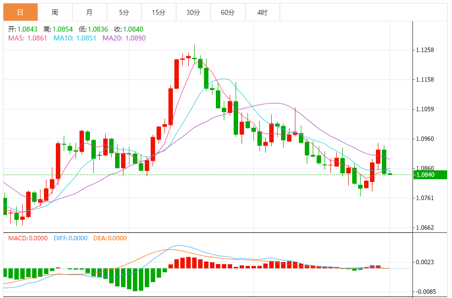 周五,欧元/美元徘徊于1.0841关口下方,现交投于1.0841附近,跌幅0.03%。
