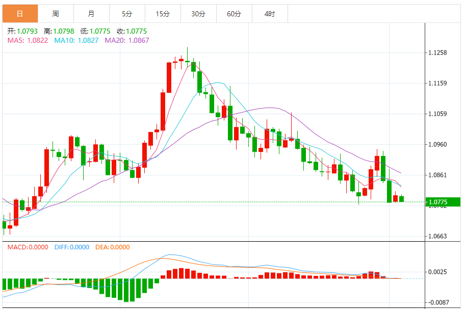 周二,欧元/美元徘徊于1.0778关口下方,现交投于1.0778附近,跌幅0.17%。