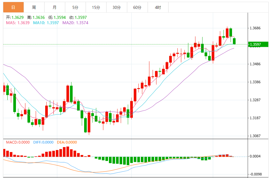 周一,美元/加元徘徊于1.3598关口下方,现交投于1.3598附近,跌幅0.33%。