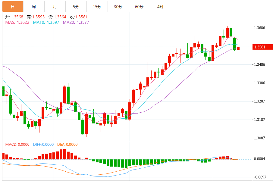 周二,美元/加元徘徊于1.3584关口下方,现交投于1.3584附近,涨幅0.11%。