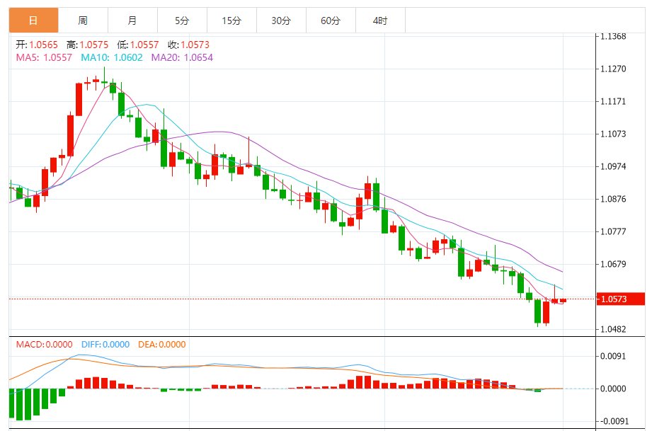周一,欧元/美元徘徊于1.0575关口下方,现交投于1.0575附近,涨幅0.01%。