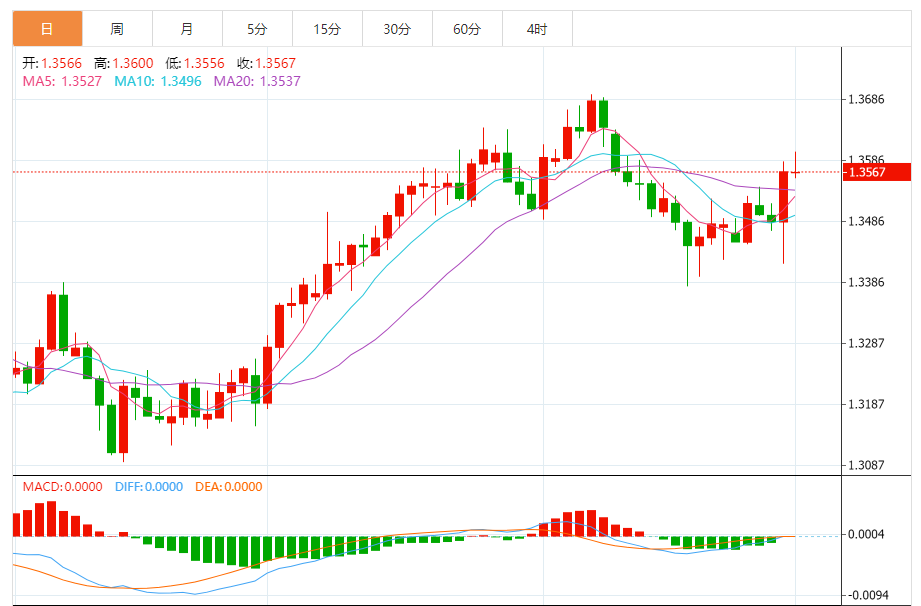 周一,美元/加元徘徊于1.3565关口下方,现交投于1.3565附近,跌幅0.03%。