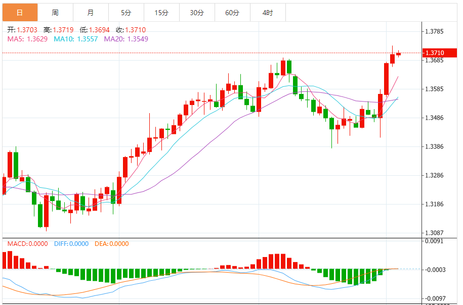 周三,美元/加元徘徊于1.3713关口下方,现交投于1.3713附近,涨幅0.04%。