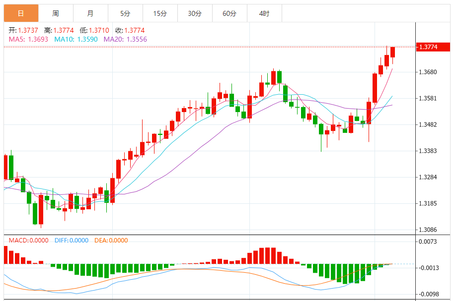 周四,美元/加元徘徊于1.3776关口下方,现交投于1.3776附近,涨幅0.22%。