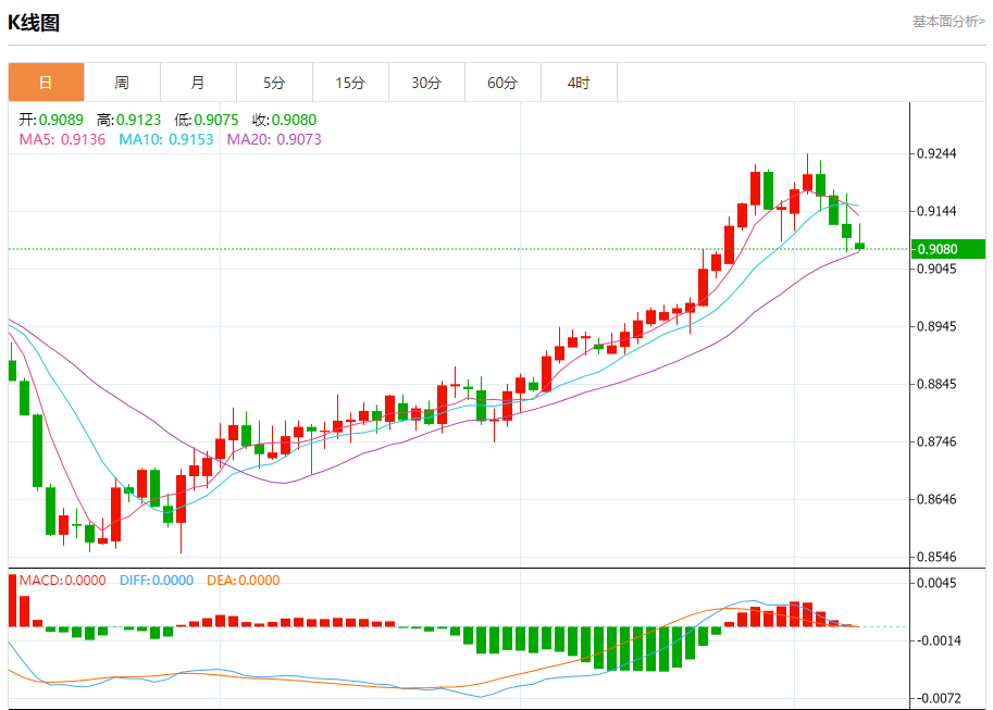 今日周一,澳元兑美元报0.6373,跌幅0.18%;美元兑加元报1.3642,跌幅0.14%;美元兑瑞郎报0.9083,跌幅0.21%。