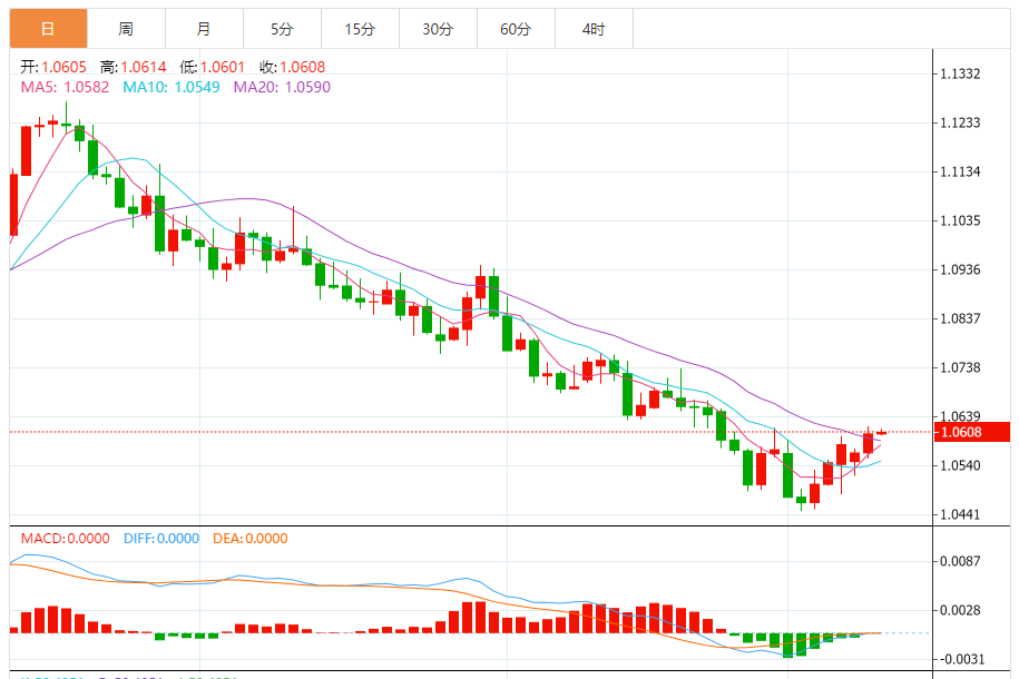 周三,欧元/美元徘徊于1.0608关口下方,现交投于1.0608附近,涨幅0.02%。
