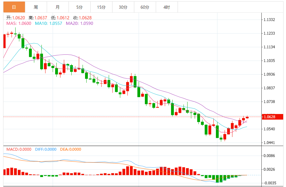 周四,欧元/美元徘徊于1.0629关口下方,现交投于1.0629附近,涨幅0.08%。