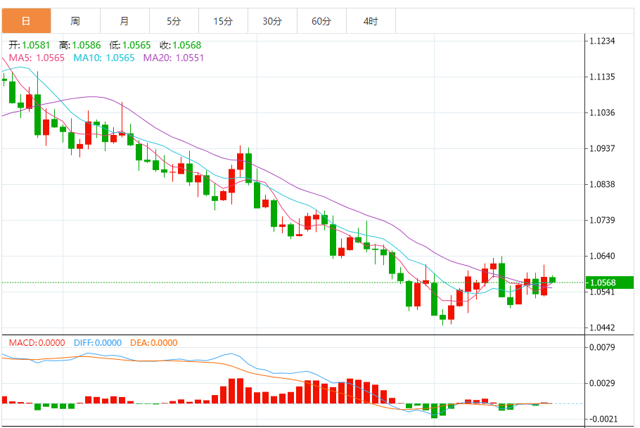 周五,欧元/美元徘徊于1.0568关口下方,现交投于1.0568附近,跌幅0.14%。