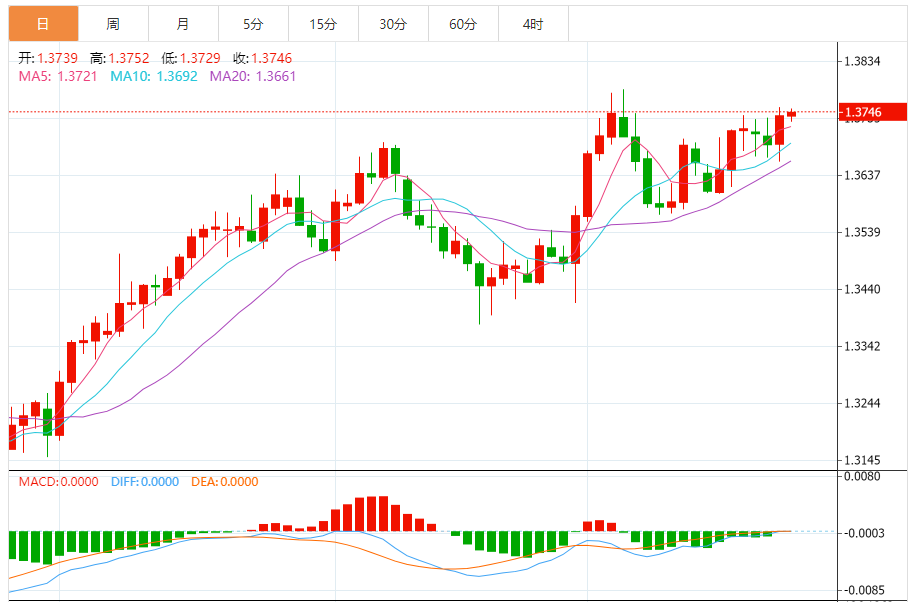 周三,美元/加元徘徊于1.3748关口下方,现交投于1.3748附近,涨幅0.05%。