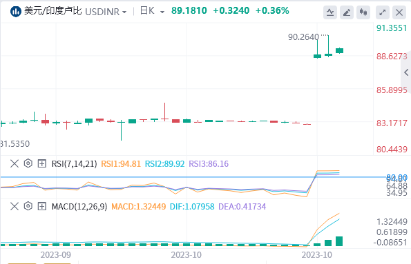 印度卢比日线走强。美元/印度卢比交投于83.00-83.35的区间。同时,美元/印度卢比日线处在100天和200天指数移动均线(EMA)上方,表明美元/印度卢比上行趋势保持不变。