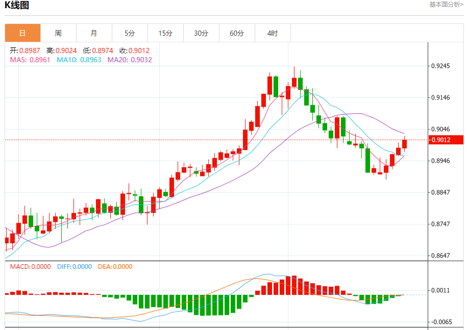 今日周五,澳元兑美元报0.6347,涨幅0.40%;美元兑加元报1.3825,跌幅0.05%;美元兑瑞郎报0.9014,涨幅0.28%。