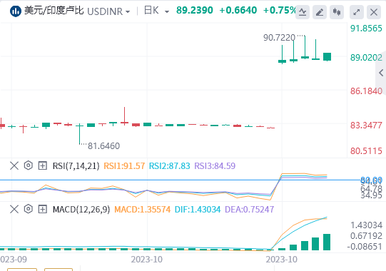 美元/印度卢比突破交易区间上沿83.35后出现明确买盘,都将推动美元/印度卢比反弹至年内迄今(YTD)高点83.45。进一步上行方面,下一个上行阻力位于心理整数关口84.00。下行方面,关键支撑位在83.00,该水平是10月20日的低点和整数关汇合处。若跌破83.00点,则可能跌至82.82点(9月12日低点),然后跌至82.65点(8月4日低点)。