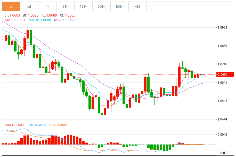 周一,欧元/美元徘徊于1.0686关口下方,现交投于1.0686附近,涨幅0.01%。