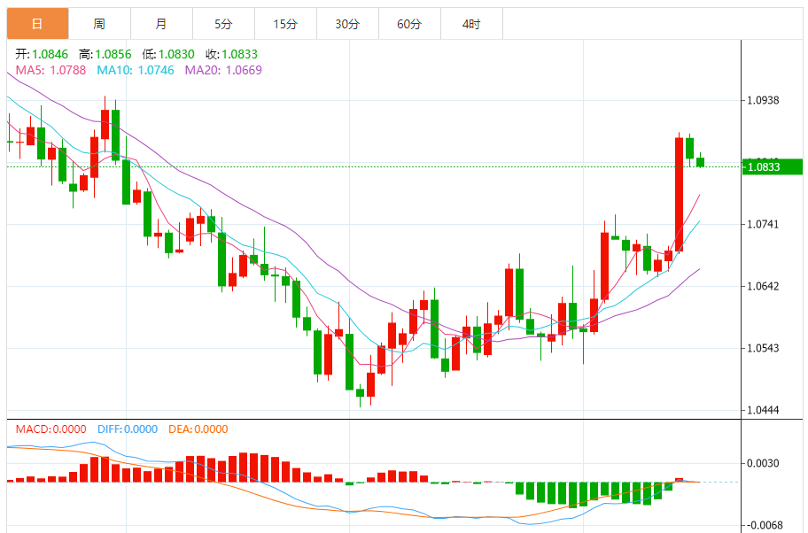 周四,欧元/美元徘徊于1.0835关口下方,现交投于1.0835附近,跌幅0.11%。