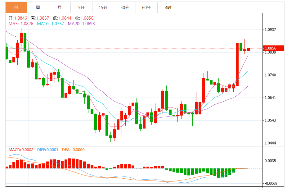 周五,欧元/美元徘徊于1.0856关口下方,现交投于1.0856附近,涨幅0.04%。