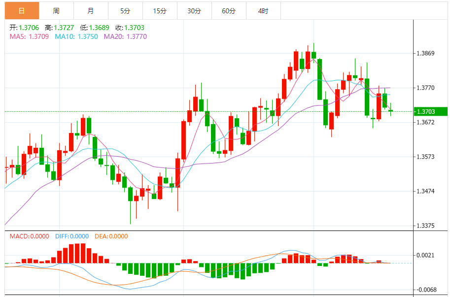 周一,美元/加元徘徊于1.3705关口下方,现交投于1.3705附近,跌幅0.08%。