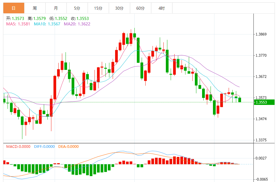 周二,美元/加元徘徊于1.3554关口下方,现交投于1.3554附近,跌幅0.15%。