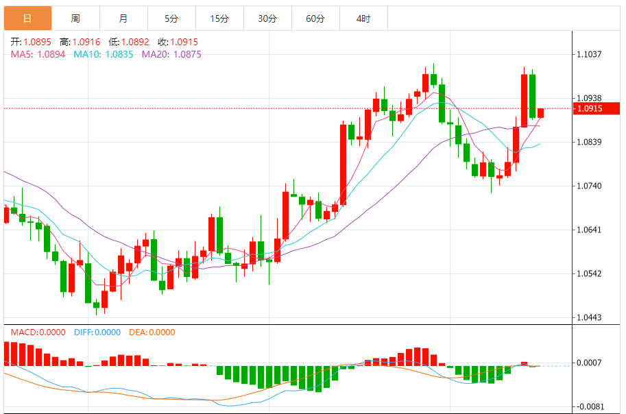 周一,欧元/美元徘徊于1.0917关口下方,现交投于1.0916附近,涨幅0.19%。