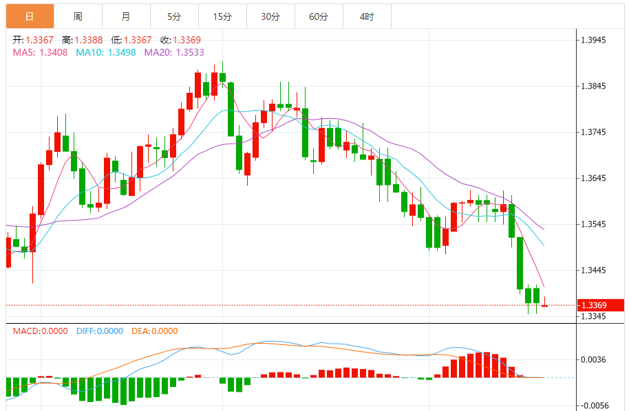 周一,美元/加元徘徊于1.3371关口下方,现交投于1.3369附近,跌幅0.04%。