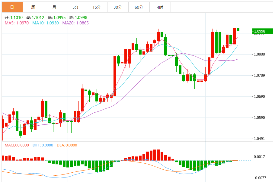 周五,欧元/美元徘徊于1.0999关口下方,现交投于1.0998附近,跌幅0.11%。