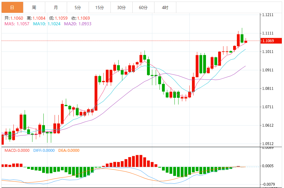 周五,欧元/美元徘徊于1.1071关口下方,现交投于1.1070附近,涨幅0.08%。