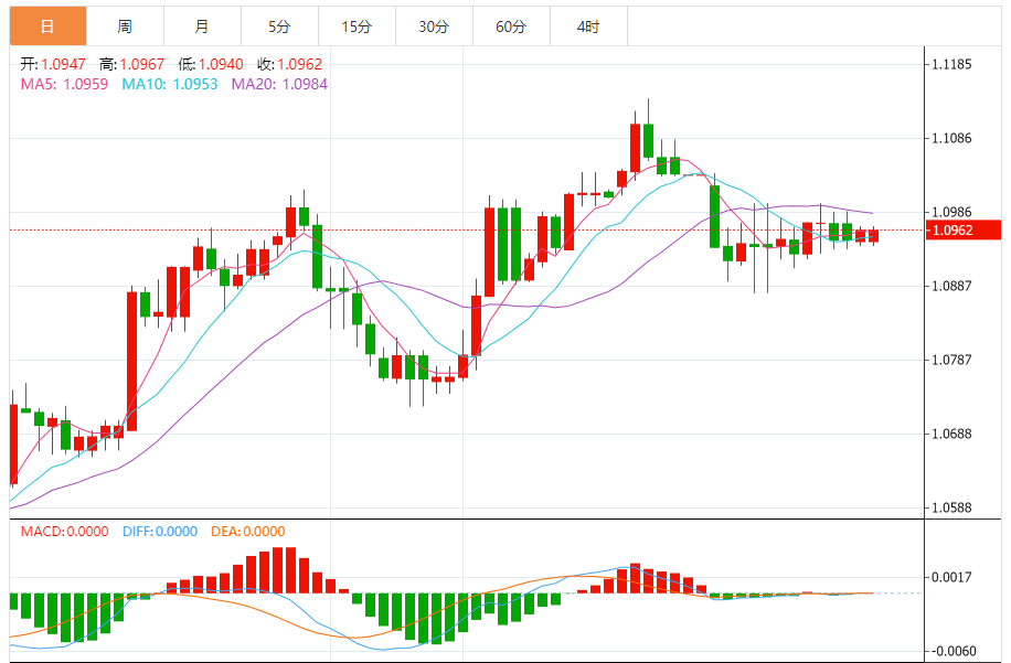 周一,欧元/美元徘徊于1.0963关口下方,现交投于1.0962附近,涨幅0.12%。