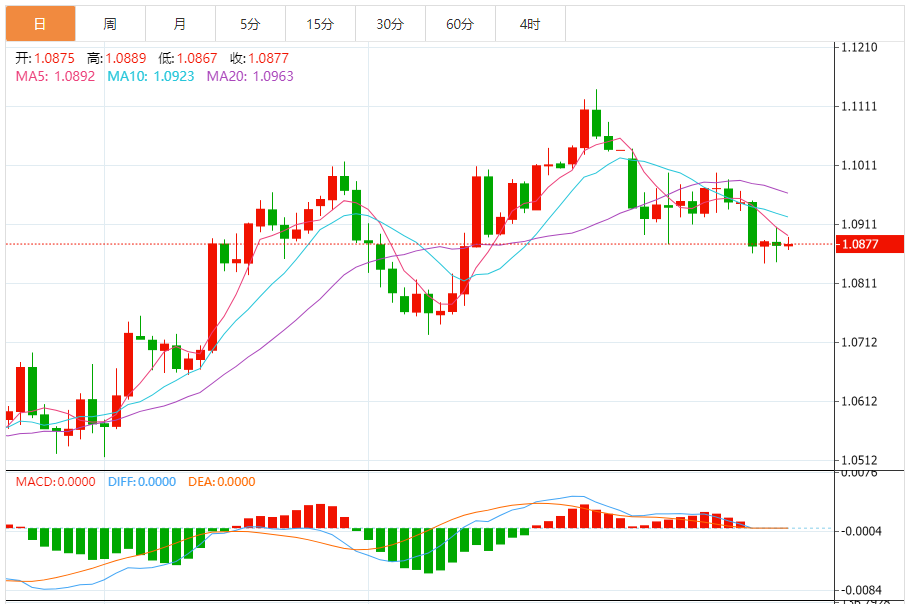 周五,欧元/美元徘徊于1.0878关口下方,现交投于1.0877附近,涨幅0.02%。