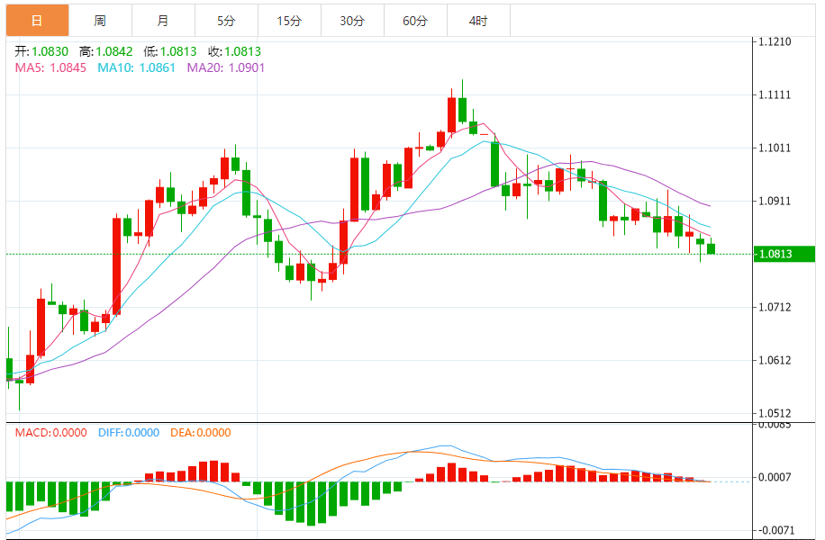 周二,欧元/美元徘徊于1.0813关口下方,现交投于1.0813附近,跌幅0.17%。