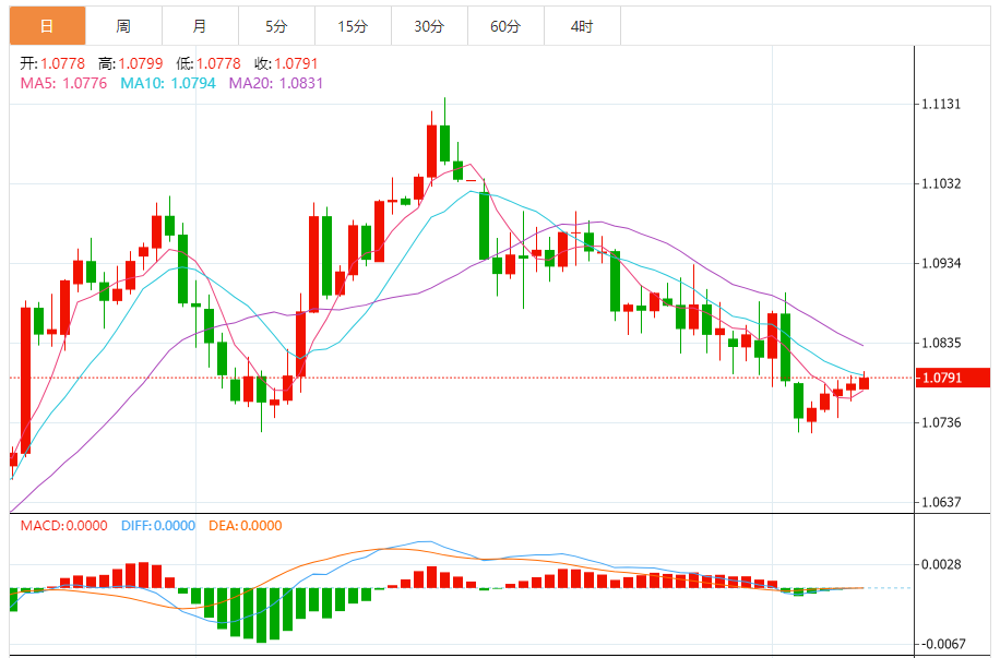 周一,欧元/美元徘徊于1.0792关口下方,现交投于1.0791附近,涨幅0.06%。